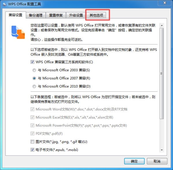 第四步,接着软件就会弹出【WPS?Office配置工具】窗口了,在此窗口的最上方,我们找到【其他选项】,并点击进入。