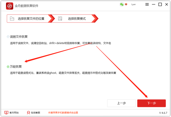 第二步、在这里,勾选“万能恢复”,然后点击“下一步”。