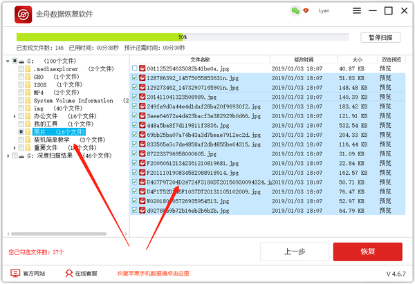 第四步、选中文件后,直接点击“恢复”就可以了,无需等待扫描结束后。