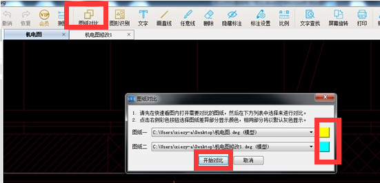 第一步,打开最新版CAD快速看图软件,把需要进行对比的CAD图纸也都打开,并点击上方工具栏上的【图纸对比】按钮,在弹出的图纸对比窗口的右侧可以选择对比的颜色。