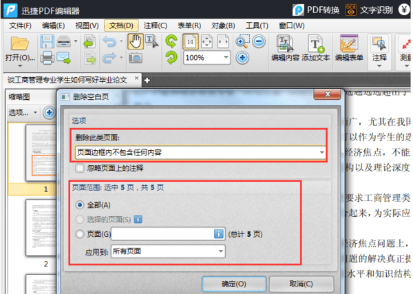 第三步,进入到【删除空白页】对话框,在【删除此类页面】种选择【页面边框内不包含任何内容】选项,然后在【页面范围】处勾选【全部】,最后点击【确定】,所有PDF中的空白页就都删除了。