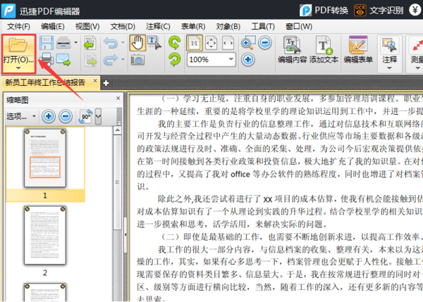 第一步,打开已经安装好的迅捷PDF编辑器,点击页面左上角的【打开】,把需要删除空白页的PDF文件打开。