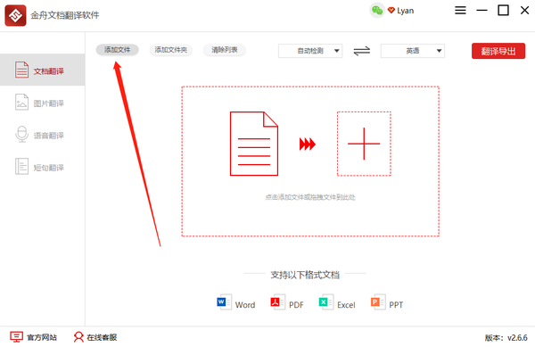 第二步、然后,点击“添加文件”将需要翻译的文档上传到软件中。在操作界面的正下方,有显示当前支持的文档输入格式,根据此要求上传文件就可以了。