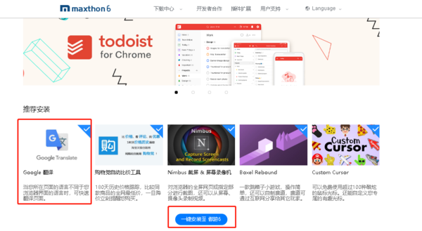 想要在傲游浏览器上,安装使用翻译工具,首先需要进入扩展程序中心。打开傲游浏览器后,点击页面上方的扩展程序图标,在弹出的选项窗口,点击“获取更多”键。跳转到插件中心后,在推荐安装中就有“谷歌翻译”插件,选中后,点击“一键安装至傲游6”就行了。