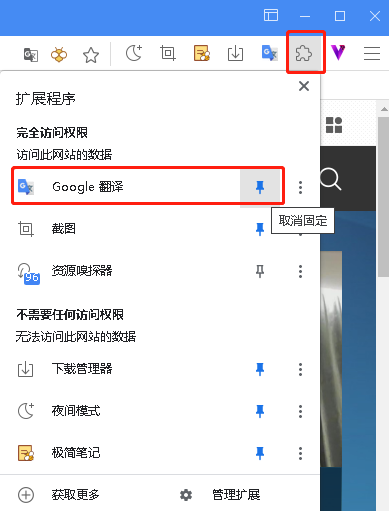 下载安装完翻译工具之后,还需要将翻译工具固定到工具栏中,同样是点击扩展程序图标,在弹出的窗口中,找到谷歌翻译工具,点击选项右侧的“固定”图标就行了。