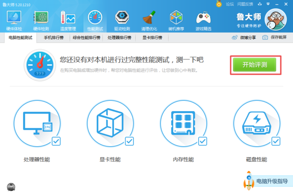 第三步,进入到鲁大师的性能测试界面后,我们直接点击界面中的【开始评测】按钮,就可以对电脑的显卡性能、处理器性能、硬盘性能等进行跑分了。