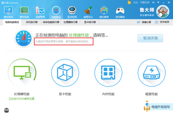 第四步,鲁大师跑分的过程当中,我们只需要耐心的等待一会儿后,软件就会得出电脑的跑分了。而在鲁大师跑分的过程当中,最好不要对电脑进行任何的操作,同时将电脑上所打开的程序全部关闭退出后,再对电脑进行跑分,这样得出的跑分结果才更加的准确。