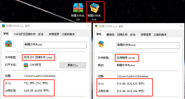 首先,使用2345好压生成的自解压文件,在格式上是“.exe”文件,不是一般的Zip或RAR压缩文件。在解压时,自解压文件会弹出解压选项卡,用户可以自由选择解压后文件的保存位置,与一般的压缩包使用右键“解压到”功能类似。同时,在文件大小和占用空间上,自解压文件会比压缩文件大很多,占用空间也会比较多。