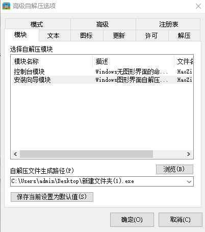 在弹出的自解压选项界面,可以自定义设置文件生成路径,更改好保存位置之后,点击“确定”键,等软件创建生成完自解压文件就可以了。