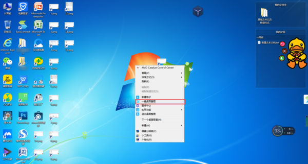 第七步,若是日后我们还需要在桌面上添加文件或者是软件的话,然后桌面的图标又变乱了的话,那么此时我们在电脑的桌面上,直接按下鼠标的右键,在弹出的选项中,选择【一键桌面整理】选项,电脑管家就可以一键帮我们快速的整理桌面图标了。