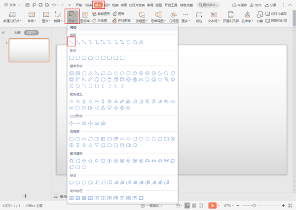 在PPT中新建一个空白页,点击工具栏中的插入—形状—直线。
