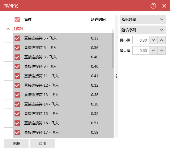 再次进入序列化,选择延迟时间—随机序列,将最小值设置为0.3,最大值设置为0.6,勾选名称后点击应用。