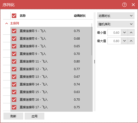 选择动画时长—随机序列,将最小值设置为0.6,最大值设置为0.8,勾选名称后点击应用。