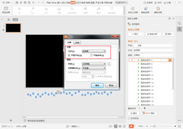 全选所有直线,移动到画布外,点击工具栏中的动画—飞入,在效果选项中设置为与上一动画同时,方向调整为自顶部。