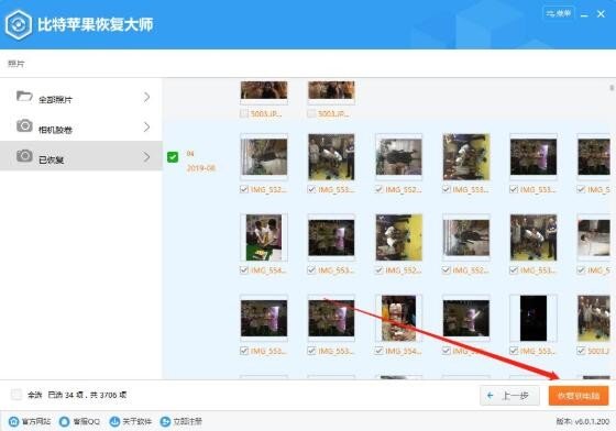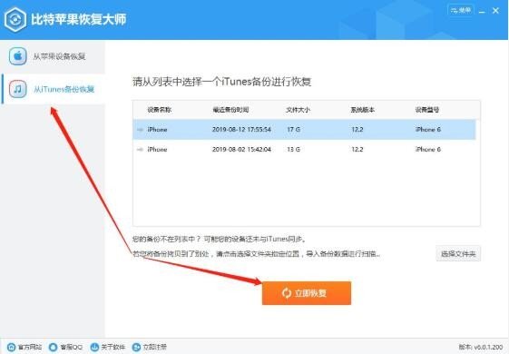 第一步、下载并安装比特苹果恢复大师,运行软件,选择【通过iTunes备份恢复】模式,选择需要恢复备份的手机,点击【开始恢复】。