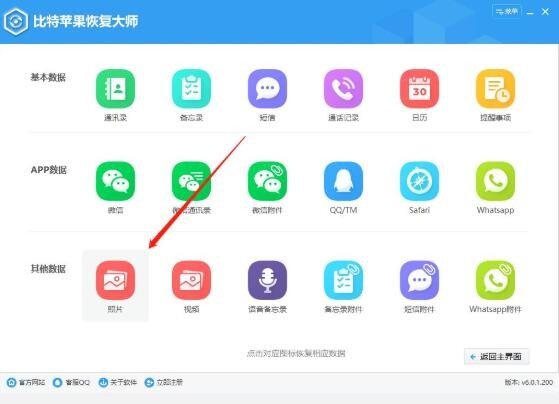 第二步、进入软件的功能界面,点击“照片”图标,等待扫描设备中的数据。