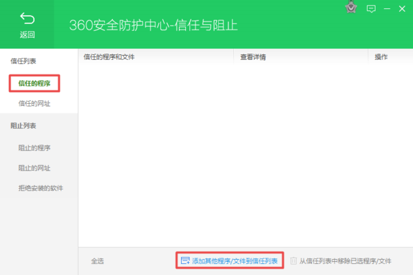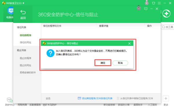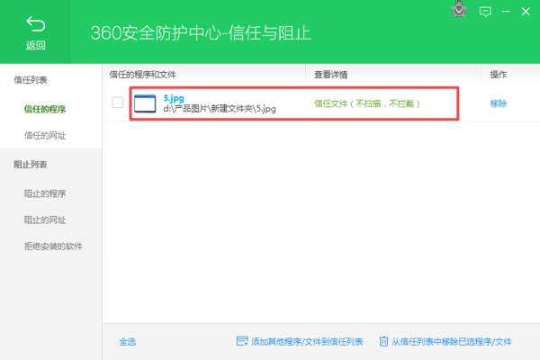 第七步,同时我们在360安全卫士的信任与阻止界面中,也可以看到刚才所添加的信任文件或程序了。