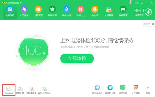 第二步,进入到360安全卫士程序的主界面当中后,我们在默认的【电脑体检】界面中,找到左下角的【防护中心】功能,并点击打开。