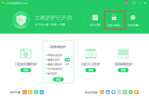 第三步,进入到360安全卫士的防护中心界面后,我们找到界面上方的【信任与阻止】选项,并点击打开。