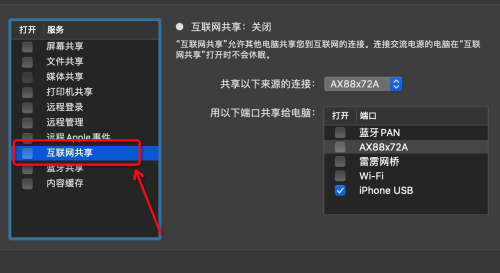 第三步:打开【共享】,选择【互联网共享】(如图所示)。