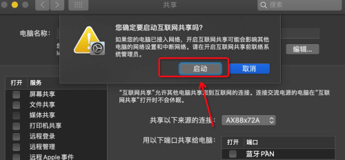 第四步:选择【互联网共享】后弹出选择框,点击【启动】即开启网络共享了(如图所示)。