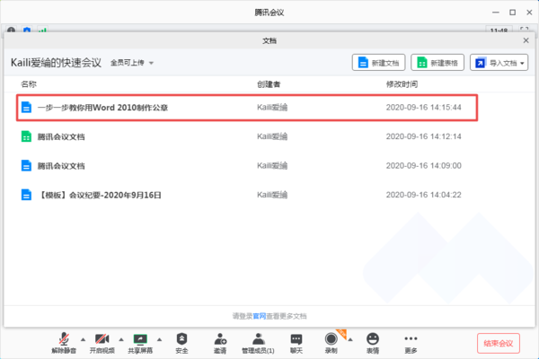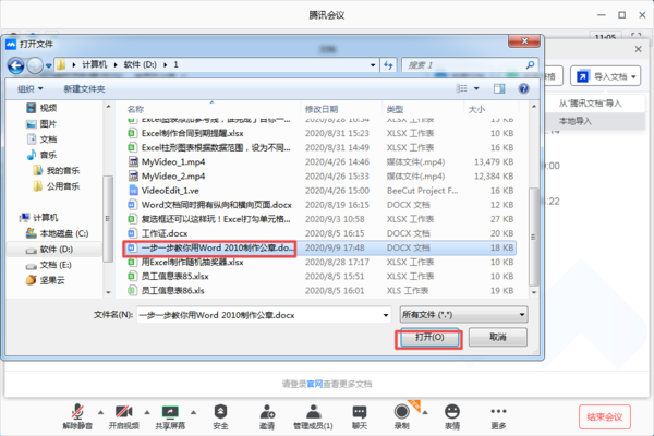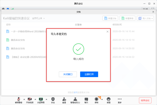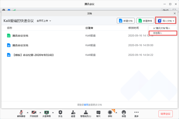 第七步,当然了,我们还可以点击【导入文档】按钮,选择从本地导入文件,或者是从腾讯文档当中导入文件,以此来共享给开会的伙伴使用。这里我们点击【本地导入】,然后在电脑上找到需要上传的文档,进行上传就可以了。