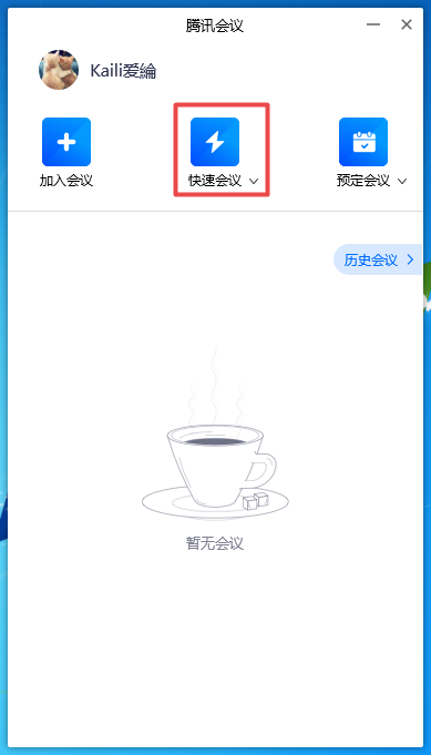 第二步,账号成功登录后,软件就会跳转到主界面当中了,我们可以点击【加入会议】按钮来进入到他人所开的会议,也可以点击【快速会议】按钮,来快速创建会议。这里,我们点击【快速会议】来自己创建一个会议。