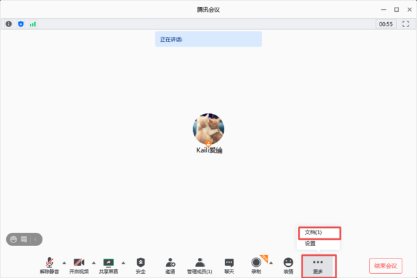 第四步,进入到会议的主界面后,我们找到窗口右下角的【...更多】图标,并点击打开,然后在弹出的选项中选择【文档】功能。