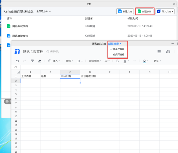 第六步,也可以点击【新建表格】按钮来新建所需要的表格。同时在新建表格的最上方的位置,我们还可以设置该文档是可以供【成员仅查看】或是【成员可编辑】的权限。