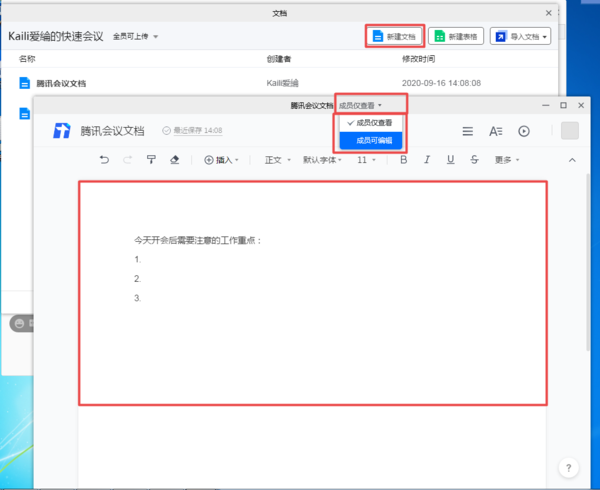 第五步,接着就会跳出【文档】窗口了,我们在这里可以直接点击界面右上角的【新建文档】按钮,来直接新建一个文档,然后在其中写上所需的内容。同时在新建文档的最上方的位置,我们还可以设置该文档是可以供【成员仅查看】或是【成员可编辑】的权限。