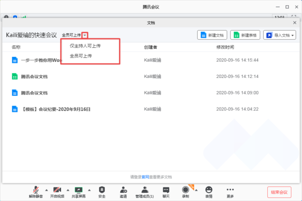 第十步,而在文档窗口的左上角的位置,我们可以看到【全员可上传】的文字,点击该文字右侧的下拉按钮,我们就可以看到有【仅主持人可上传】和【全员可上传】的选项,这里就是设置文档上传的权限的地方,根据所需进行修改即可。
