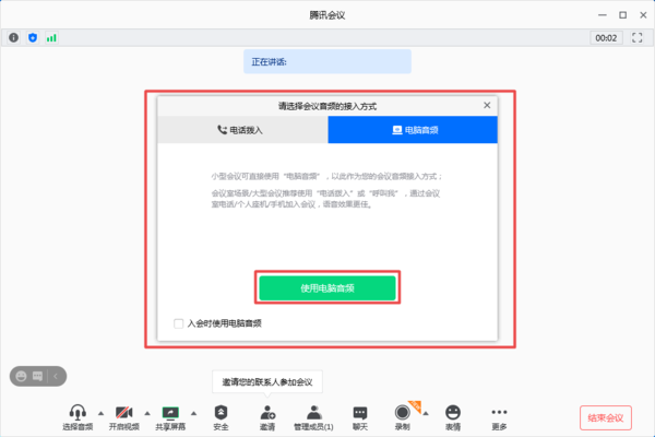 第三步,此时软件会弹出【请选择会议音频的接入方式】的窗口,我们直接点击【使用电脑音频】按钮就可以了。