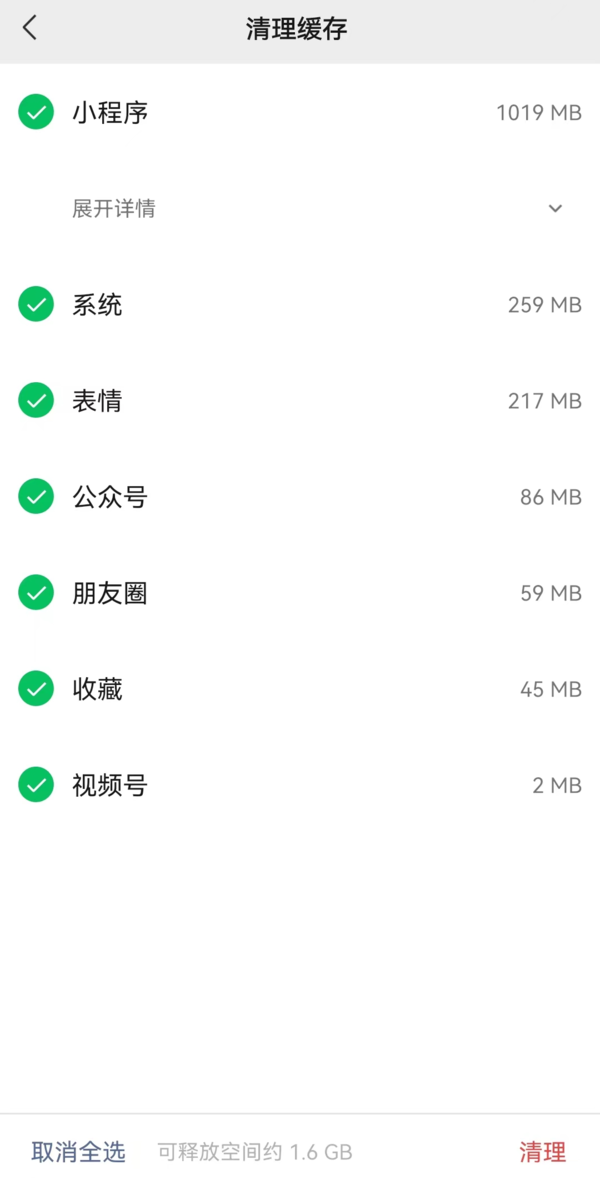 而在8.0.24最新内测版iOS微信中,在点击【前往清理】按钮后,就可以在界面上看到微信中的公众号、表情、小程序、朋友圈、视频号等选项的缓存,并且可以挑选自己想要清理的内容去进行缓存的清理了。并且,8.0.24最新内测版iOS微信还对聊天记录的清理功能进行了优化,现在它可以清理公众号的缓存文件了。