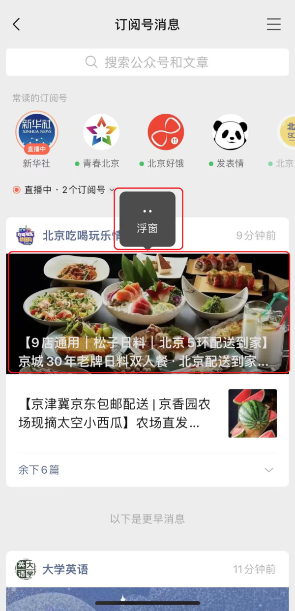 iOS微信8.0.22最新版带来的第二个新功能是订阅号的新功能,当我们在订阅号的消息页面内,长安文章封面的缩略图时,软件就会显示【浮窗】功能按钮,点击浮窗按钮后,就可以将这篇文章设置为浮窗,此功能可以帮助我们实现稍后阅读的需求。