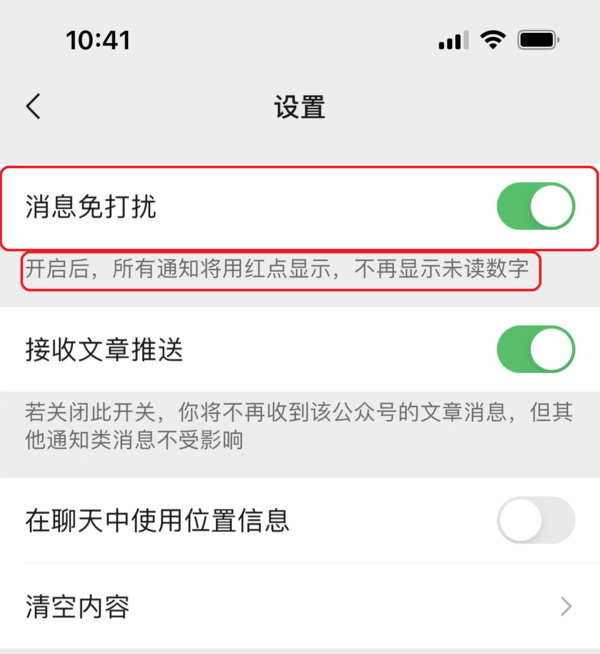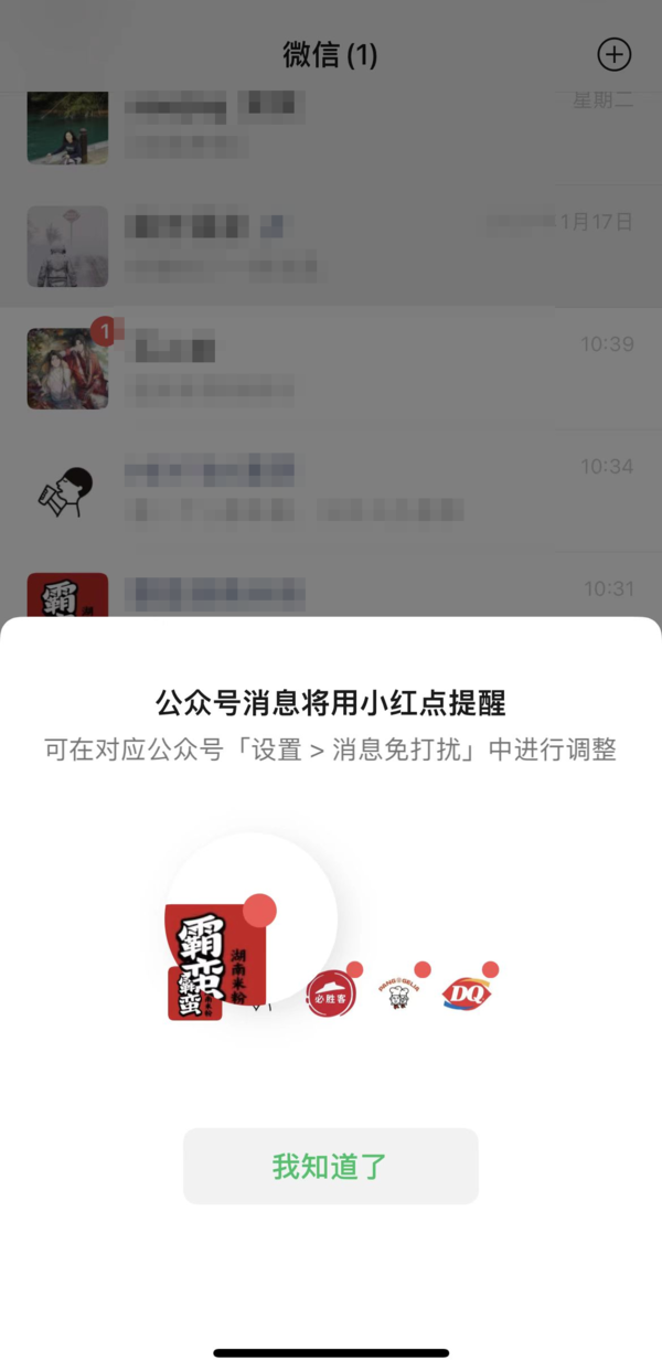 在弹出的页面中可以看到新增加了一个【消息免打扰】的功能,开启这个功能后,所有来自于这个服务号的消息就会显示为一个小红点了,而不是显示未读数字了。