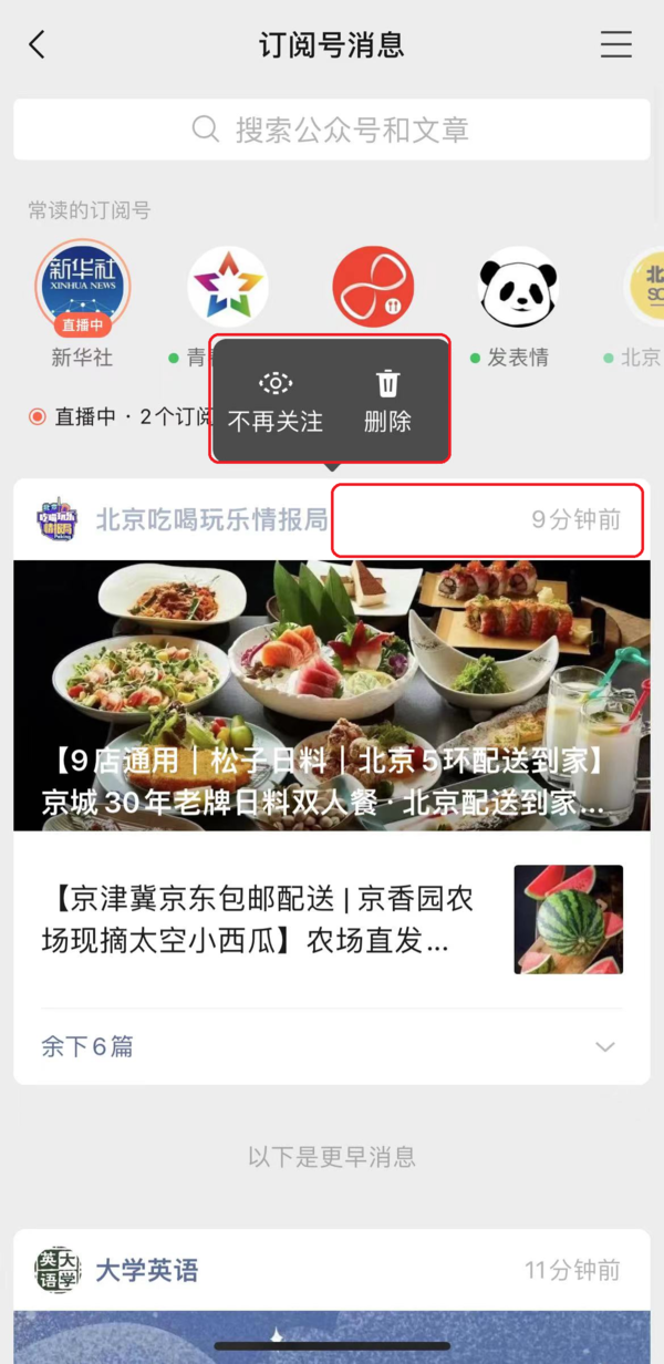 长按上面的白色区域的时候,还可以选择【删除】或【不再关注】。