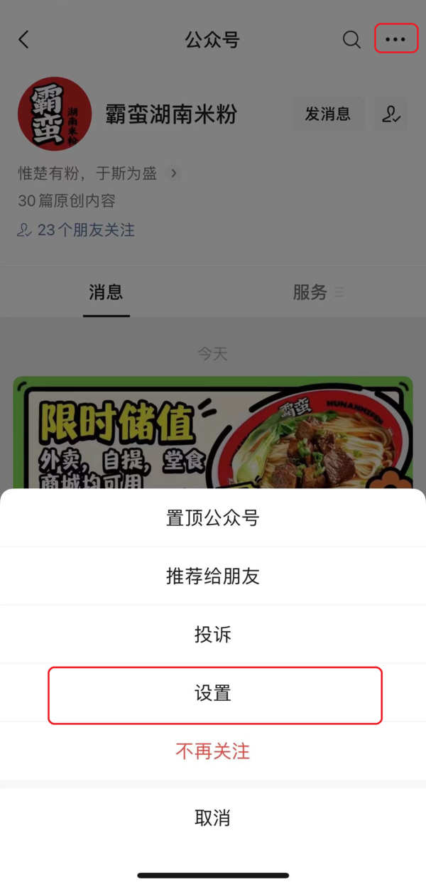 iOS微信8.0.22最新版带来的第三个新功能是服务号免打扰的功能,在服务号的界面点击【设置】选项后。