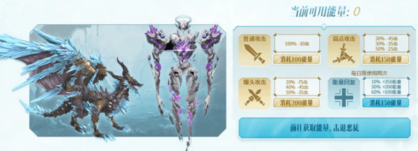 玩家在拥有足够的能量后,即可在极昼冰河活动页面中去攻击恶徒,攻击分为普通、弱点、爆头攻击,此外还有恢复能量,这4种操作需要消耗玩家不同数量的能量,且对恶徒造成不一样的效果。