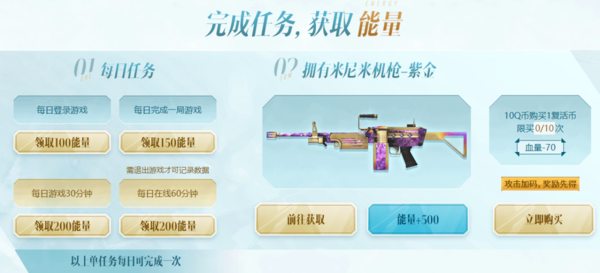 这也是逆战官方开设活动中常有的设计“游戏页面联动”,也就是玩家通过在游戏中达成条件,即可获得页面小游戏的“代币”,以“代币”来完成页面小游戏的目标,从而获得奖励。而极昼冰河活动,则是要玩家通过在线时长、游戏局数以及持有“紫金米尼米”来获得对应数量的能量。