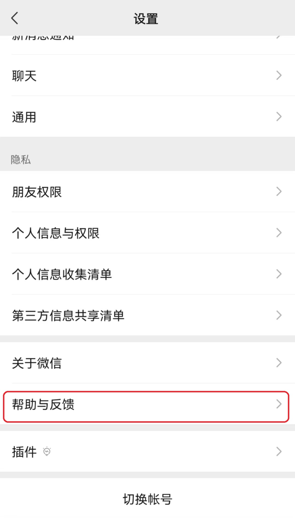 2、进入到微信的设置界面当中后,找到【帮助与反馈】选项,并点击进入。