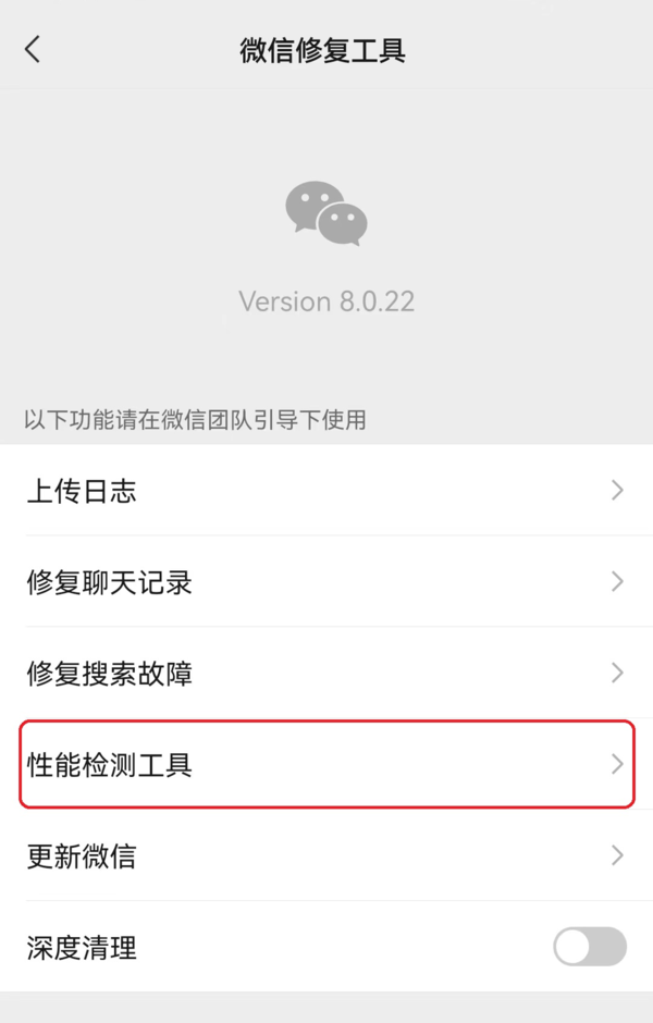 4、进入到微信的修复工具界面当中后,我们就可以找到【性能检测工具】这个新工具了,点击它。