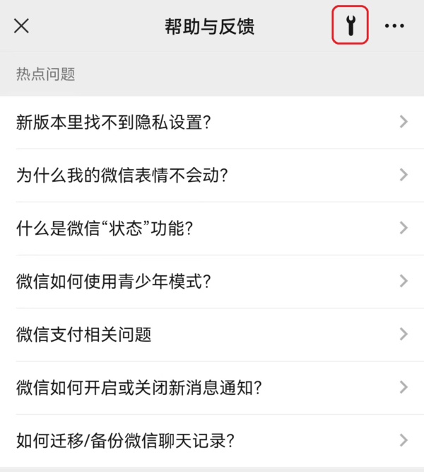 3、然后在微信的帮助与反馈界面当中,找到界面右上角的【小扳手】图标,并点击它。