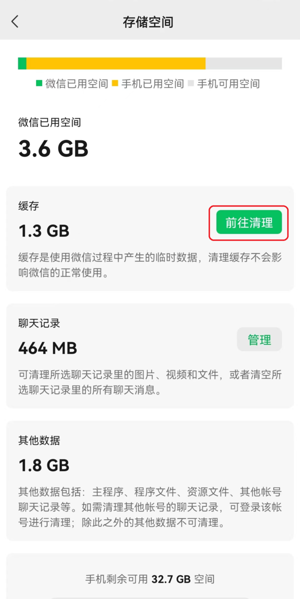 而8.0.22安卓最新版微信将【清理】按钮变成了【前往清理】按钮,点击这个按钮后,会显示出一个详细的清单,在这里,我们可以对朋友圈、小程序、公众号等占用空间进行清理,甚至我们还能够看到究竟是哪一个小程序占用这么大的空间的。