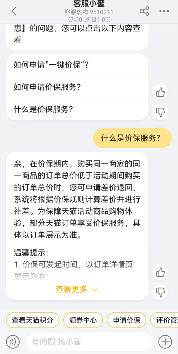 3、进入到淘宝的专属客服界面当中后,点击【价保中心】功能。