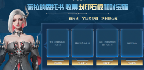 在活动期间,玩家每天都可以在官网活动页完成薇拉的委托,每天4个任务,玩家每完成一个任务即可获得一块封印石板以及薇拉宝箱;至于石板和薇拉宝箱有何用,这里先卖个小关子。另外,玩家每完成一项任务即可获得6%-10%的能量,当能量满了之后,可以从【火魔手雷】和【邪萌火神背包】中选一个获得。