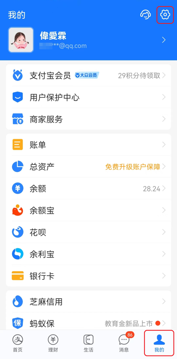 1、打开手机上的支付宝软件,然后点击界面右下角的【我的】选项,接着点击界面顶部右上角的【小齿轮】设置按钮。