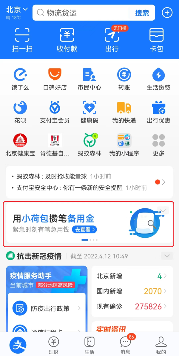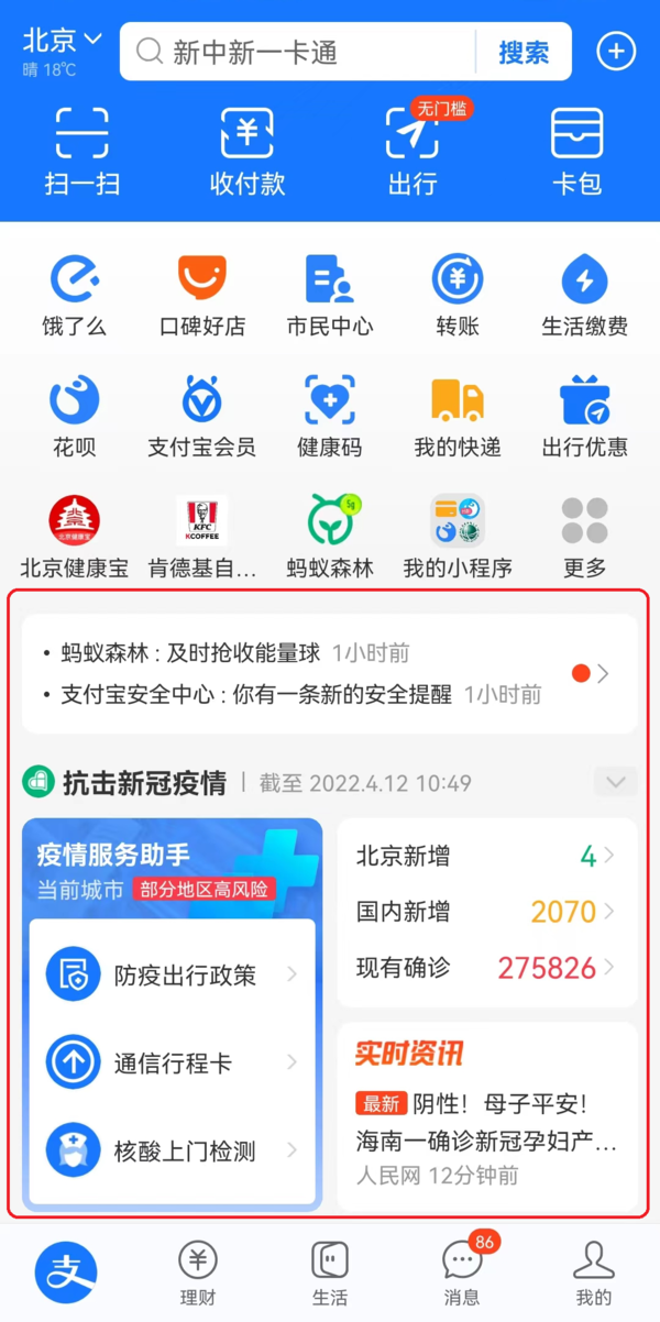 5、最后回到支付宝的首页后,我们就可以看到,支付宝首页中部的横幅广告消失不见了,页面看起来更加的清爽。