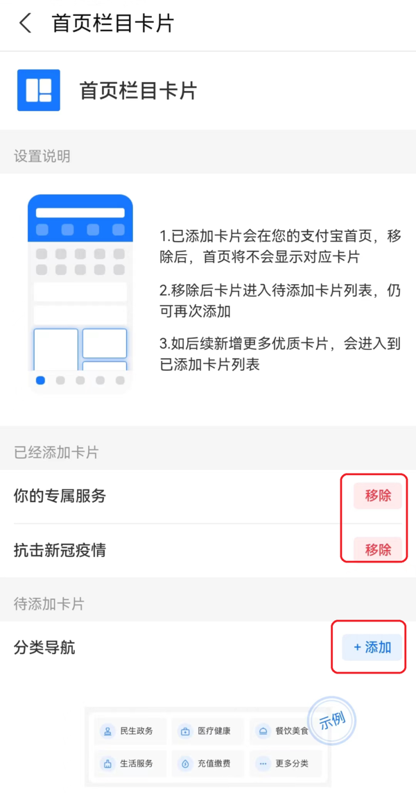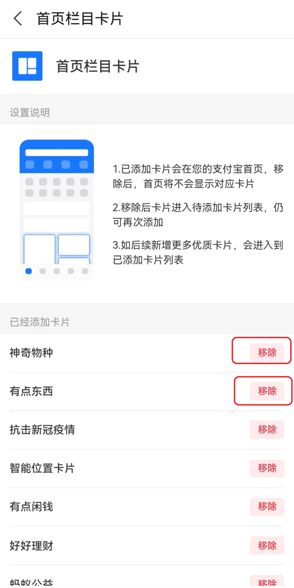 6、同时,我们在支付宝的功能管理界面中,点击【首页栏目卡片】选项,然后根据自己的使用习惯来进行相关卡片的添加或移除,还可以让支付宝的首页变得更加的简单。