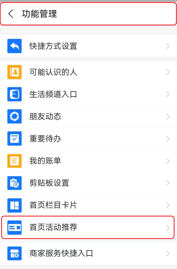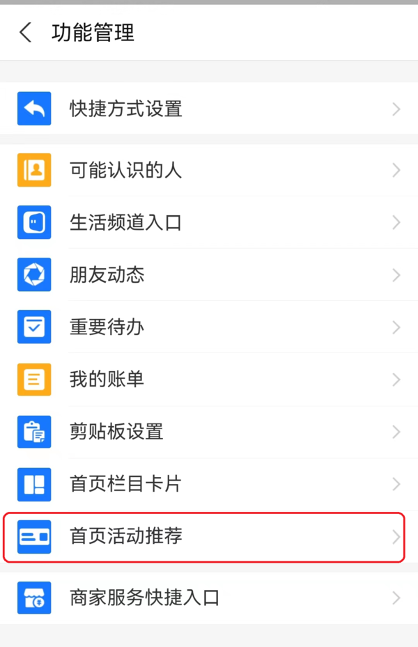 3、然后在支付宝的功能管理界面当中,我们就可以看到【首页活动推荐】选项了,点击它。