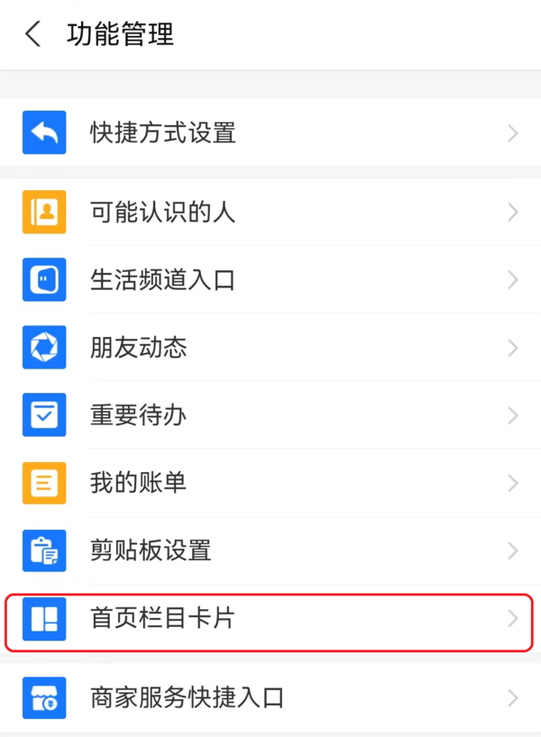 如果我们在支付宝的功能管理界面中,找不到【首页活动推荐】选项的话,我们点击【首页栏目卡片】选项,移除一部分不需要的功能,然后返回到支付宝的设置界面当中,再次点击【功能管理】选项并进入后,我们就可以看到【首页活动推荐】选项了。